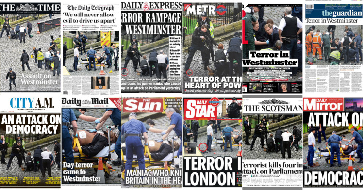 The newspaper front pages included pictures of the police officer who suffered fatal injuries in the attack receiving treatment from medical personnel and, notably, by the MP Tobias Ellwood who was one of the first on the scene and who tried, in vain, to save the officer’s life.