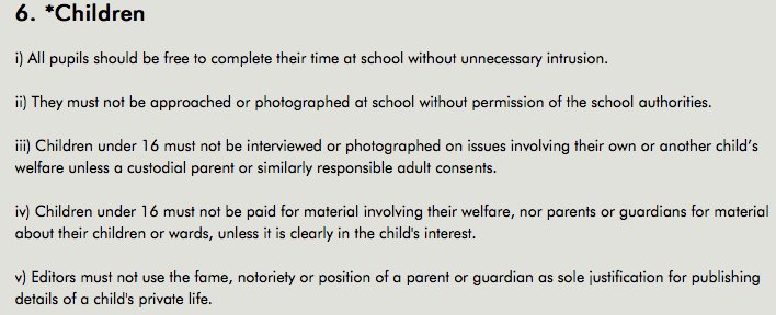 So, on to ethics. The Editors’ Code of Practice, as administered by has a few things to say about children. Firstly Clause 6, here…